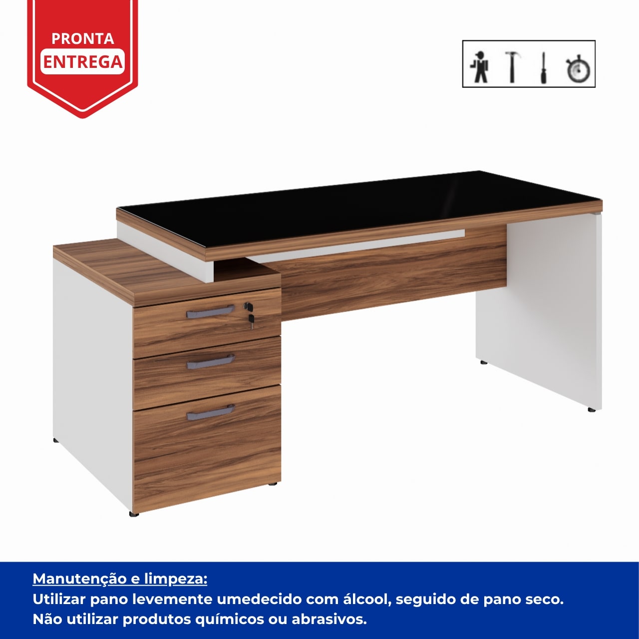 Mesa em formato Retangular, moderno e funcional, ideal para escritórios executivos e ambientes corporativos. Combina elegância com praticidade, oferecendo amplo espaço de trabalho, gaveteiro integrado e tampo com acabamento sofisticado em vidro fumê.